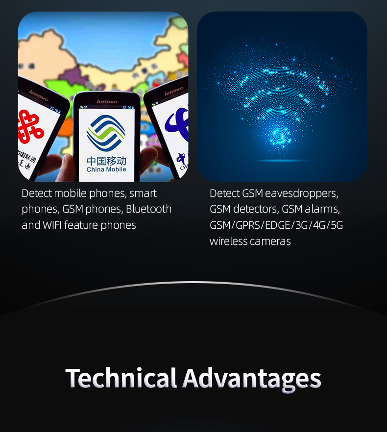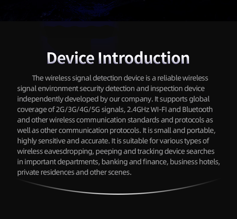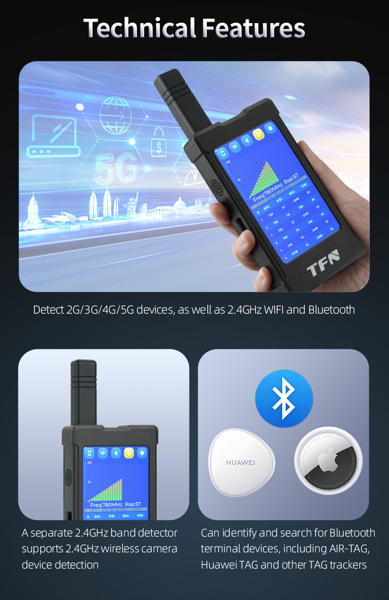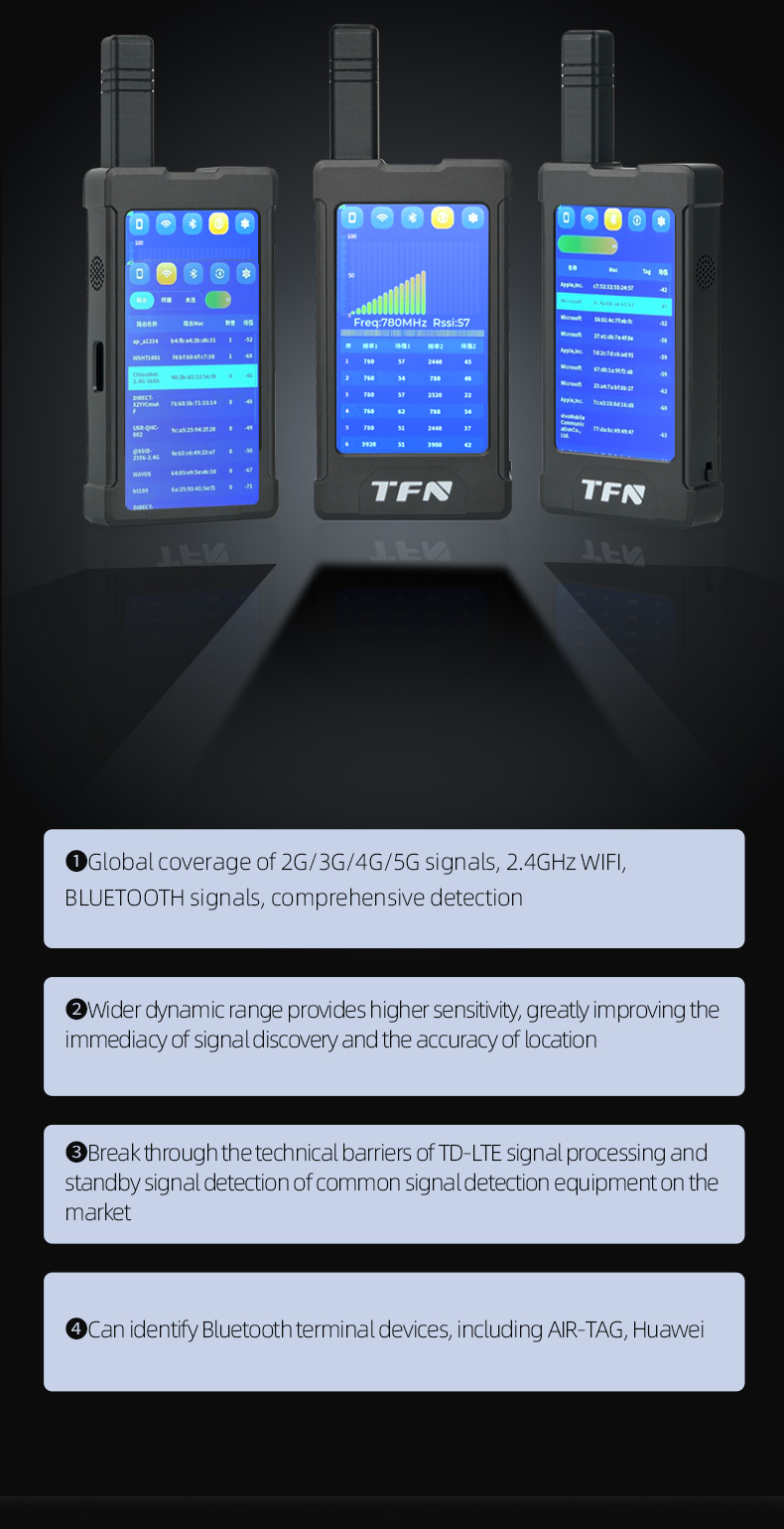 1. Detect 2G/3G/4G and the latest 5G devices, as well as 2.4GHz WiFi and Bluetooth devices.