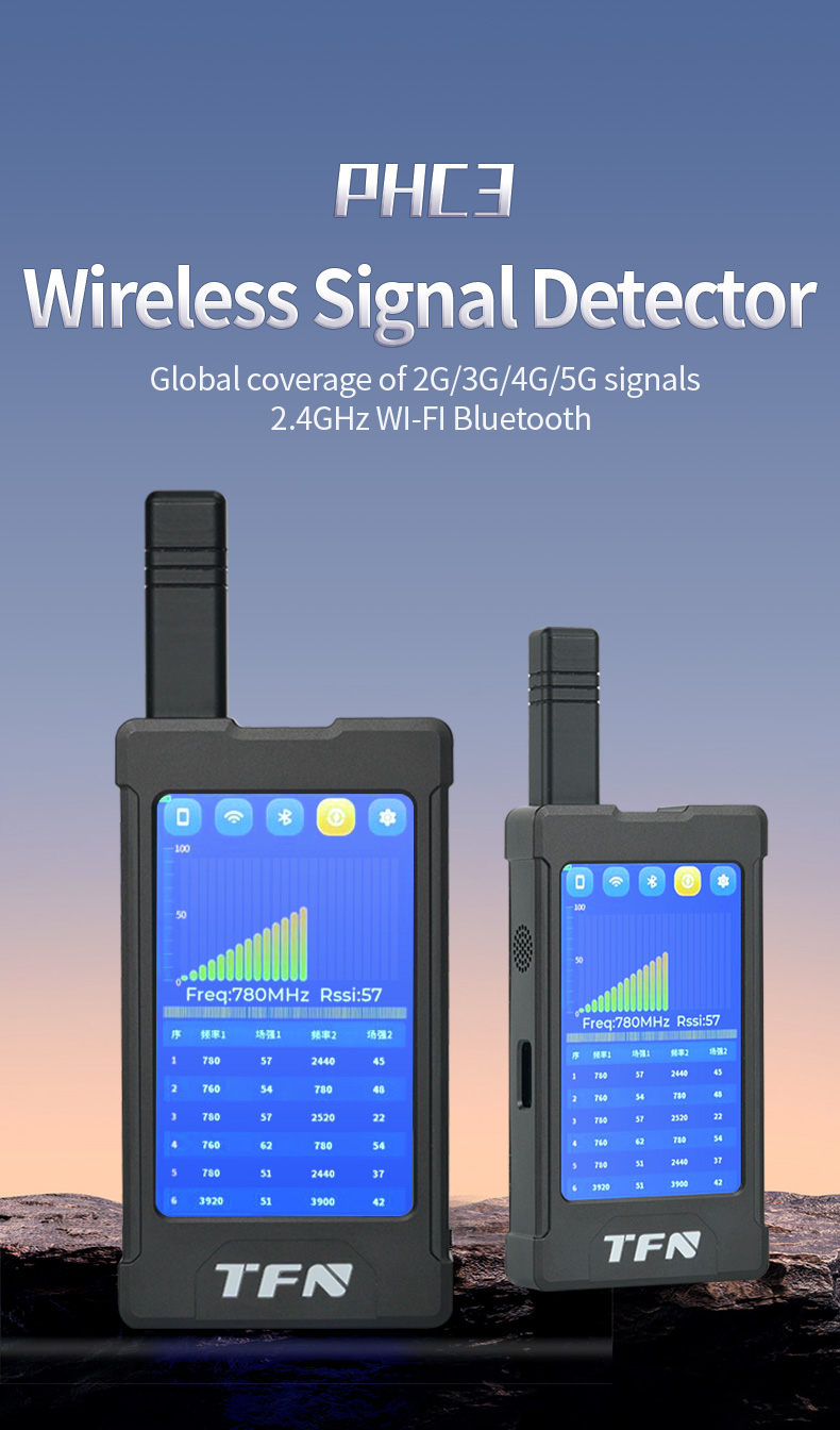 The PHC3 wireless signal detection device is a very reliable wireless signal environment security detection and inspection device launched by TFN. It supports 2G/3G/4G/5G signals, 2.4GHz Wi-Fi and Bluetooth and other wireless communication standards and protocols with global coverage, as well as other communication protocols. It is small and portable, highly sensitive and accurate, and is suitable for various types of wireless eavesdropping, peeping, and tracking device searches in military, government, banking and finance, business hotels, private residences and other scenarios.