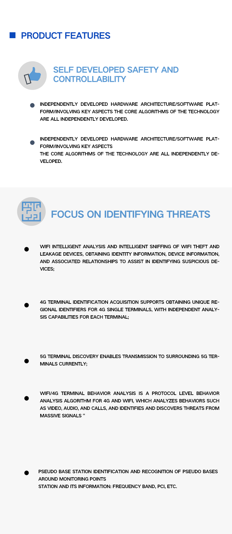 The NR17 series panoramic spectrum analyzer (information confidentiality detection equipment) is a product used to detect various types of espionage, electromagnetic leakage, electromagnetic attacks and their devices in the 9KHz~12/24GHz frequency band. On the basis of signal detection and discovery of traditional spectrum detection equipment, it further innovates and studies, focusing on the identification and discovery of "threats". The product is based on the electromagnetic signal feature library of core technology, integrating practical and practical professional detection and analysis methods such as 4G/WiFi behavior analysis and 5G terminal discovery, to achieve real-time detection, intelligent analysis, accurate identification and classification of spectrum signals,and identify and discover "threat" signals and devices from complex and massive signals. The product adopts a lightweight, highly integrated integrated design to meet the needs of safe and controllable conference security, venue security, intelligence protection, privacy protection and other inspection needs.