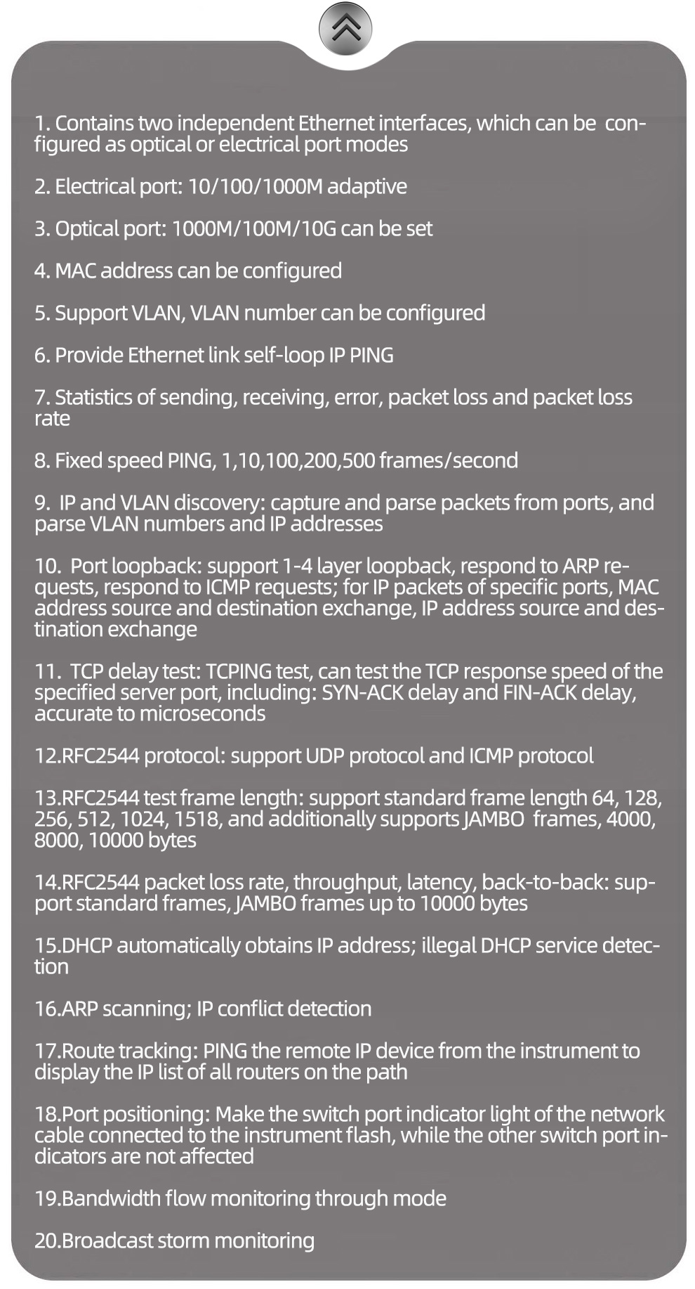 3. Support RFC2544 standard throughput, latency, jitter, frame loss and back-to-back tests
