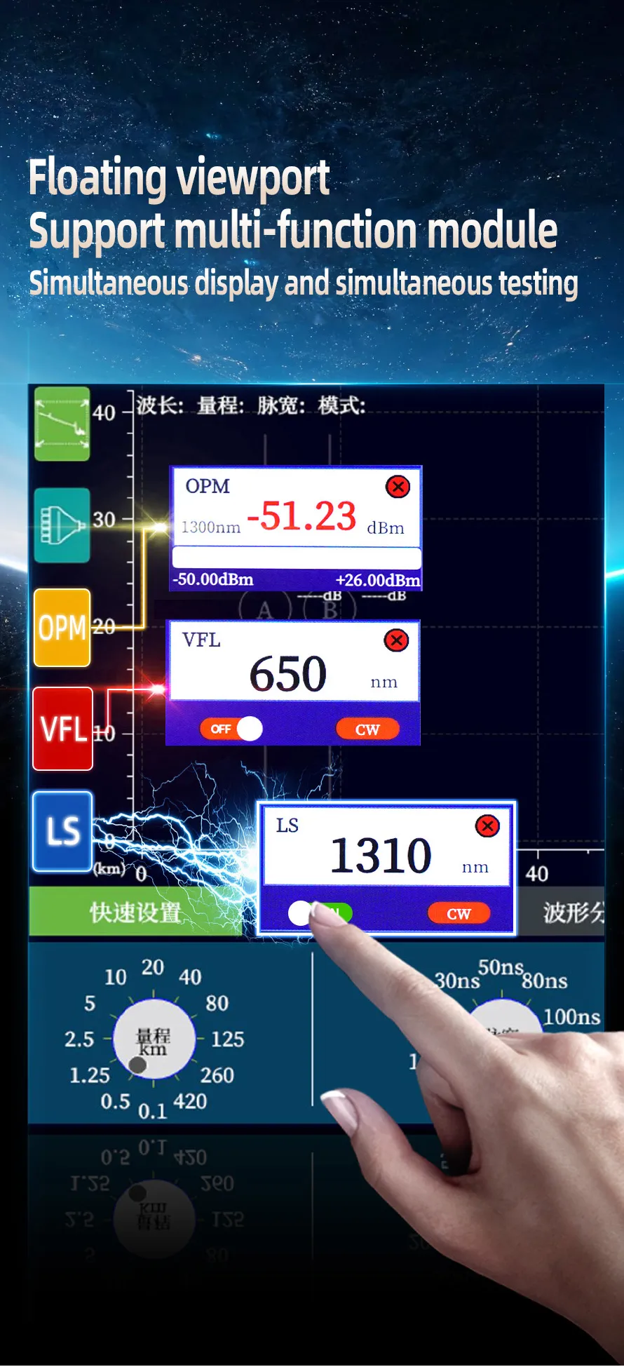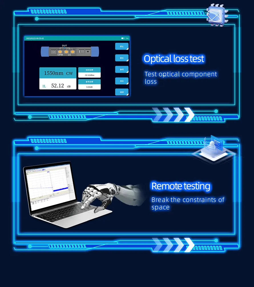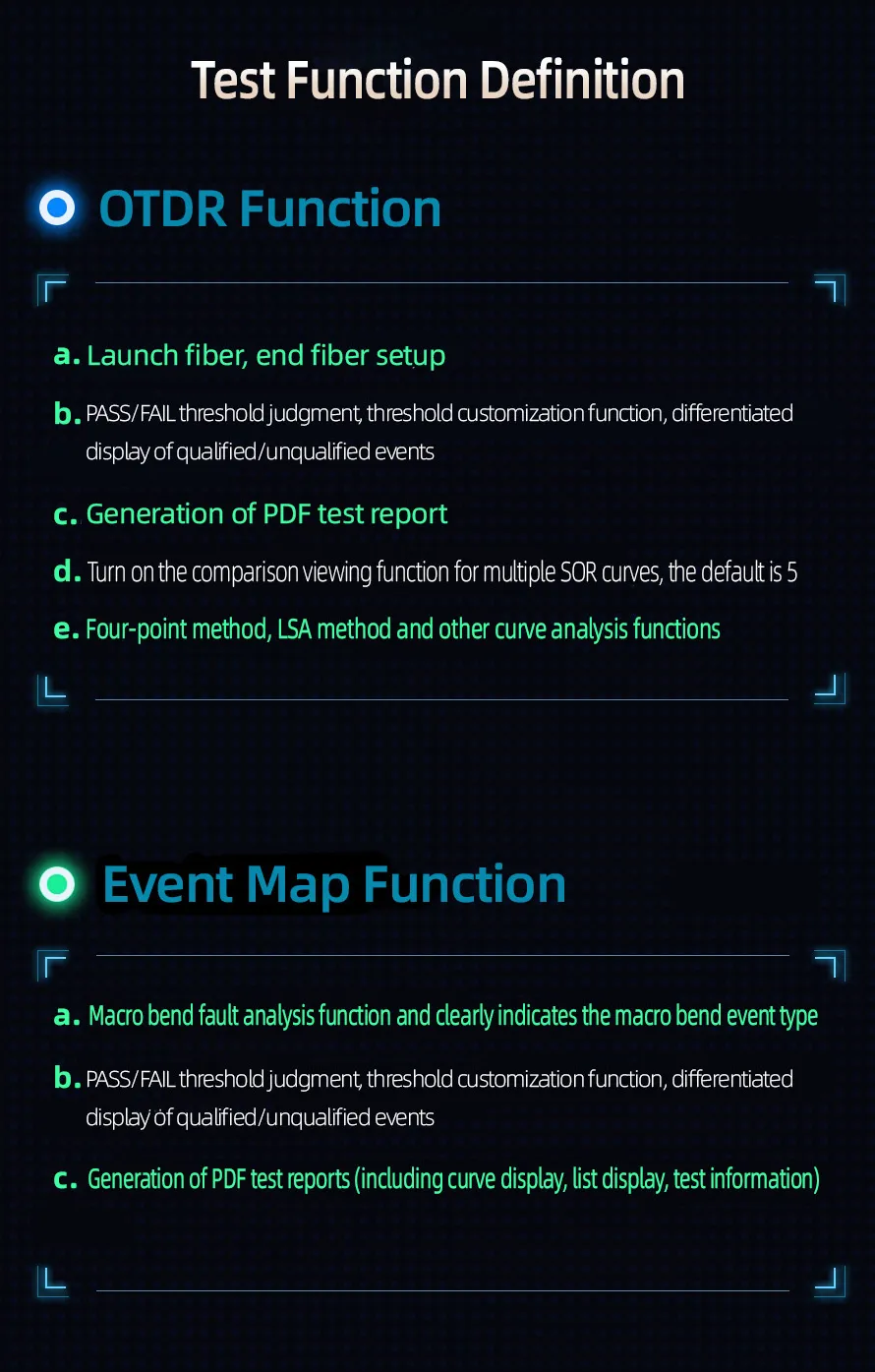 This OTDR tester can realize various testing functions such as optical laser source, optical power meter, VFL, fiber microscope, optical loss test, fault location, photoeye (MAP view), Bluetooth, single-mode and multi-mode testing according to user needs.