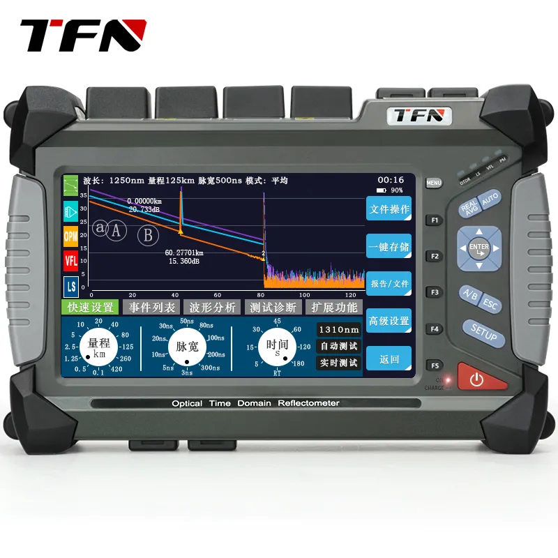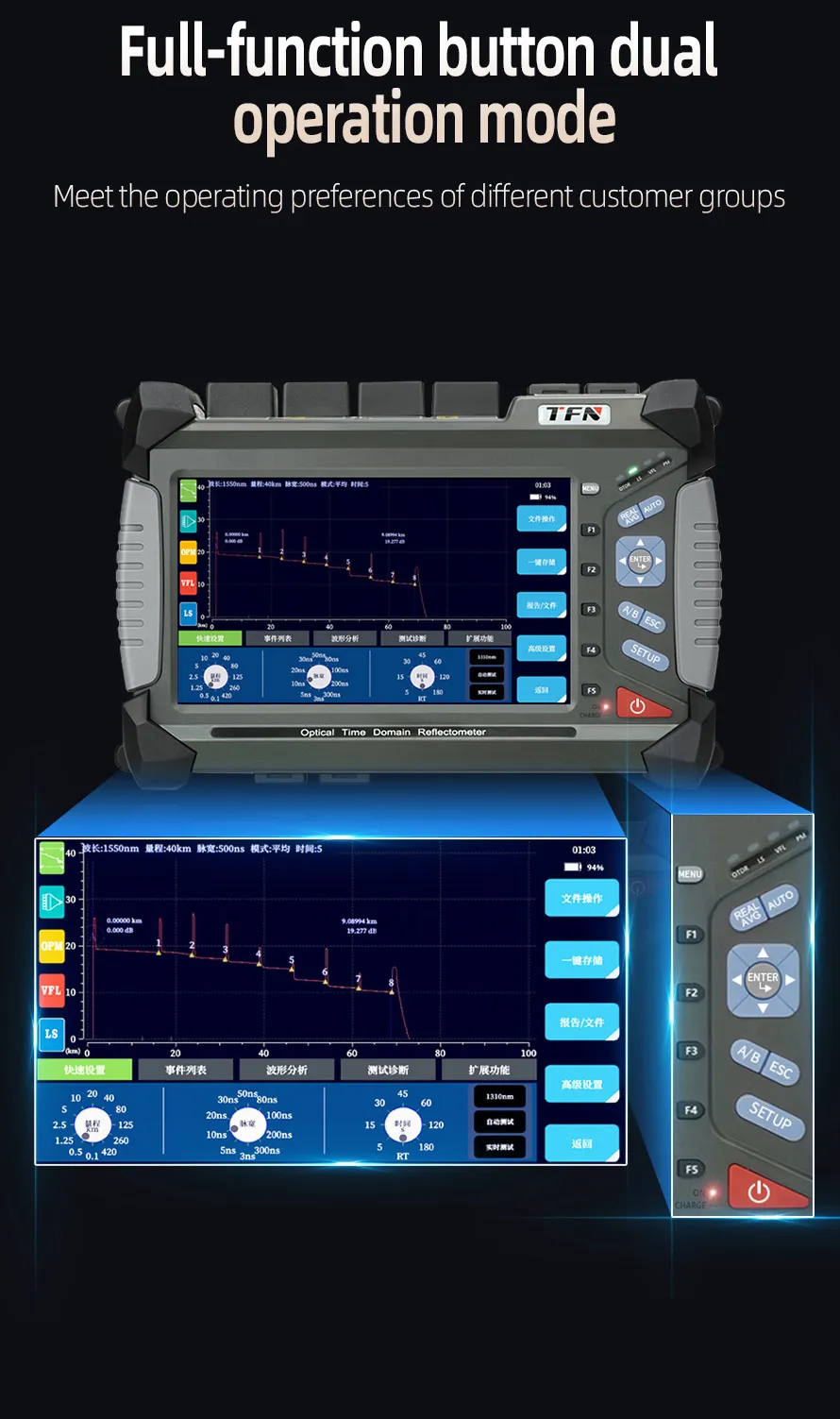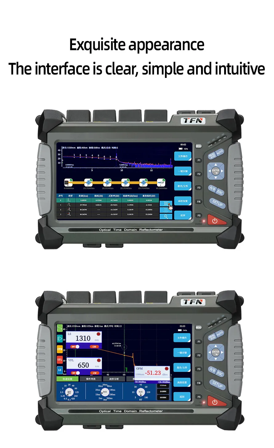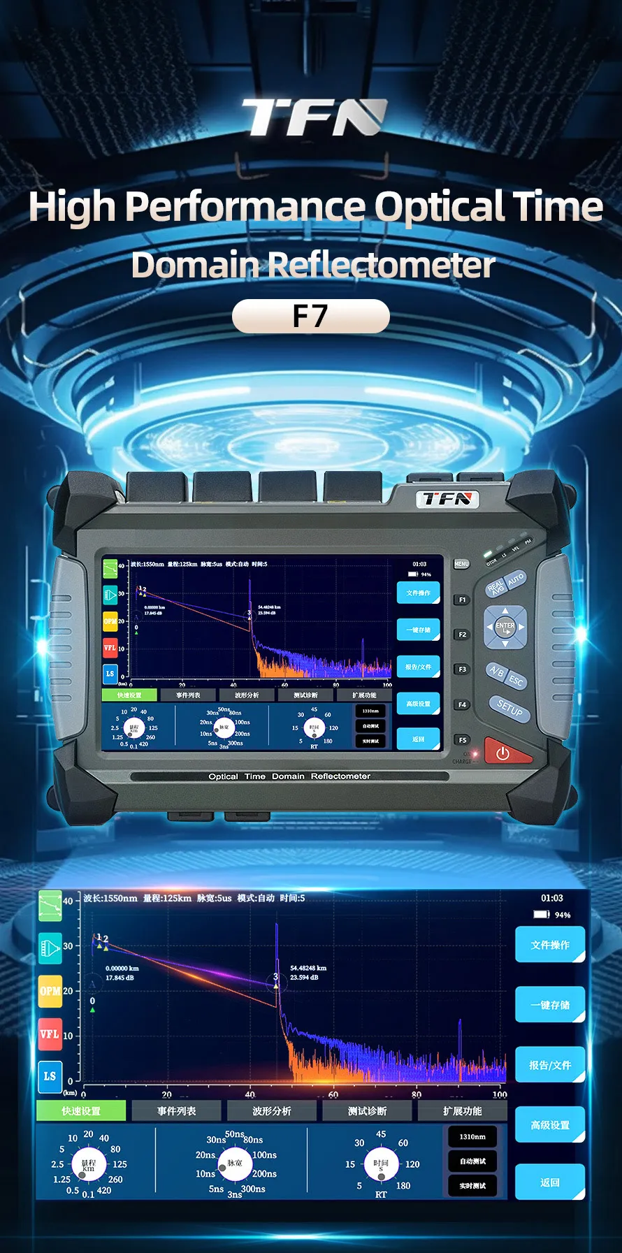 F7 OTDR (Optical Time Domain Reflectometer) is a high-performance multi-function test instrument launched for optical fiber testing. It has an 8-inch high-definition capacitive screen and full-function buttons. The product has a starting dynamic range of 35/33dB and can achieve a maximum dynamic range of 45dB and a maximum measurement range of 0.05m distance resolution, with a minimum test blind zone of 0.8m, and rich configuration function modules such as dual-wavelength, three-wavelength (for active fiber online test), four-wavelength, and single-mode and multi-mode integration. The optional online test module can achieve lossless link light Test, the unique test result self-diagnosis function greatly ensures the reliability and validity of the test results.