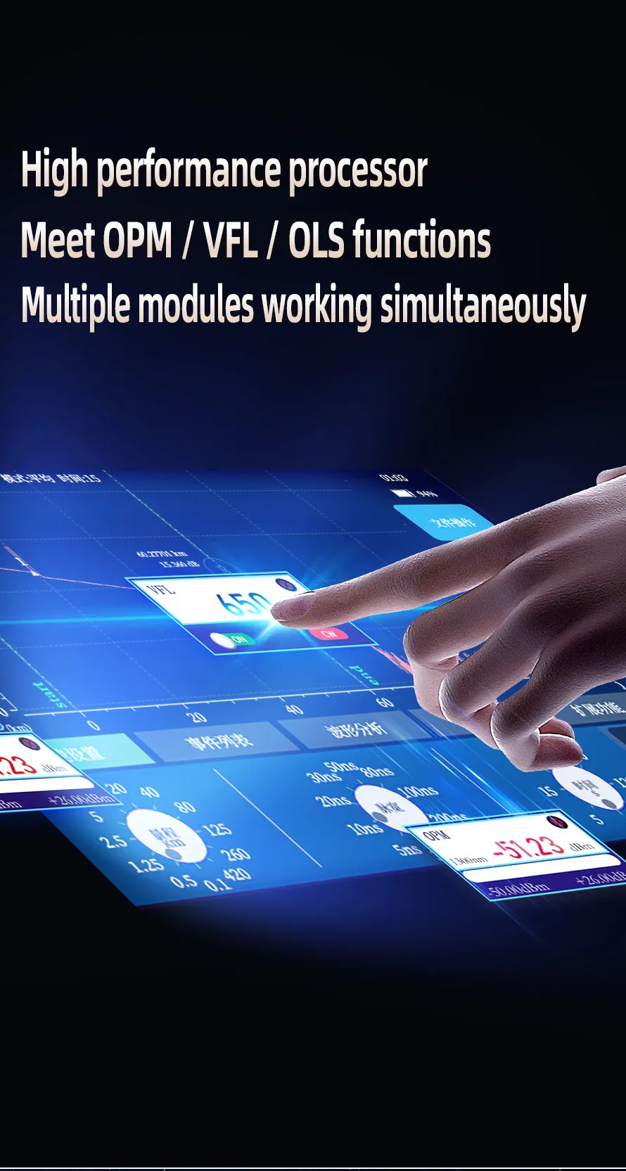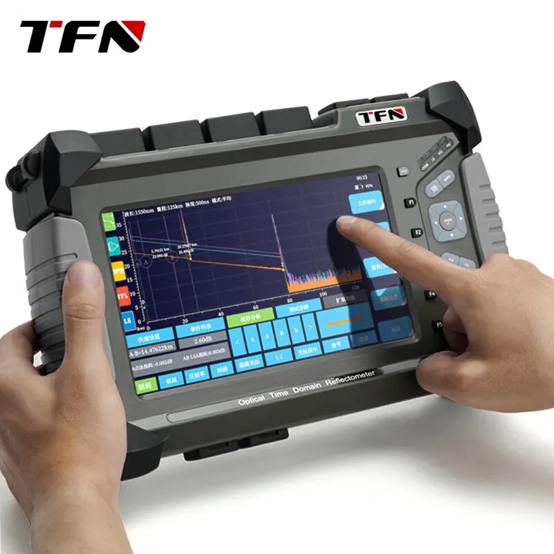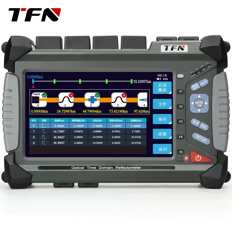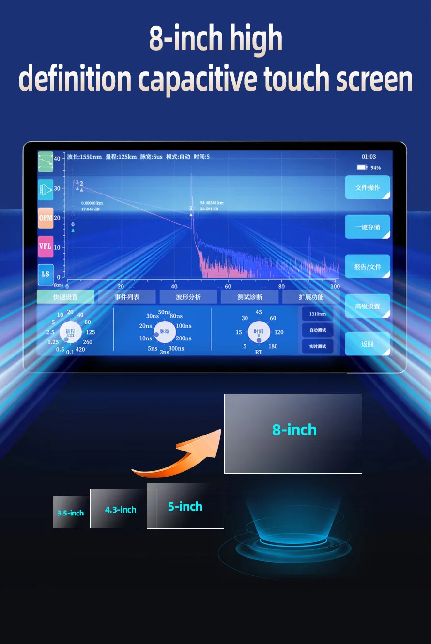 F7 OTDR (Optical Time Domain Reflectometer) is a high-performance multi-function test instrument launched for optical fiber testing. It has an 8-inch high-definition capacitive screen and full-function buttons. The product has a starting dynamic range of 35/33dB and can achieve a maximum dynamic range of 45dB and a maximum measurement range of 0.05m distance resolution, with a minimum test blind zone of 0.8m, and rich configuration function modules such as dual-wavelength, three-wavelength (for active fiber online test), four-wavelength, and single-mode and multi-mode integration. The optional online test module can achieve lossless link light Test, the unique test result self-diagnosis function greatly ensures the reliability and validity of the test results.