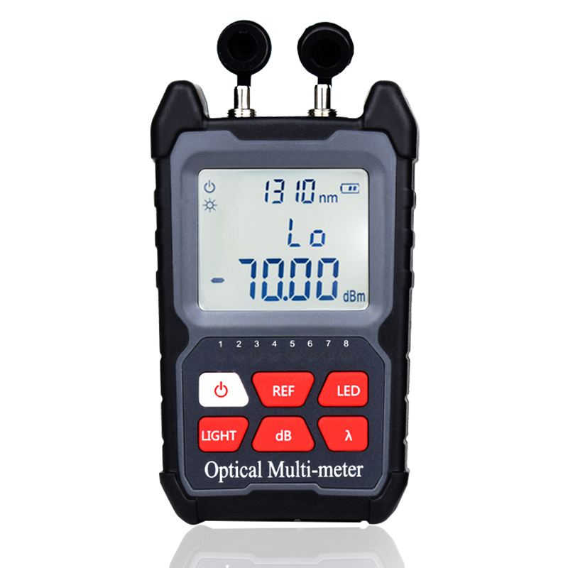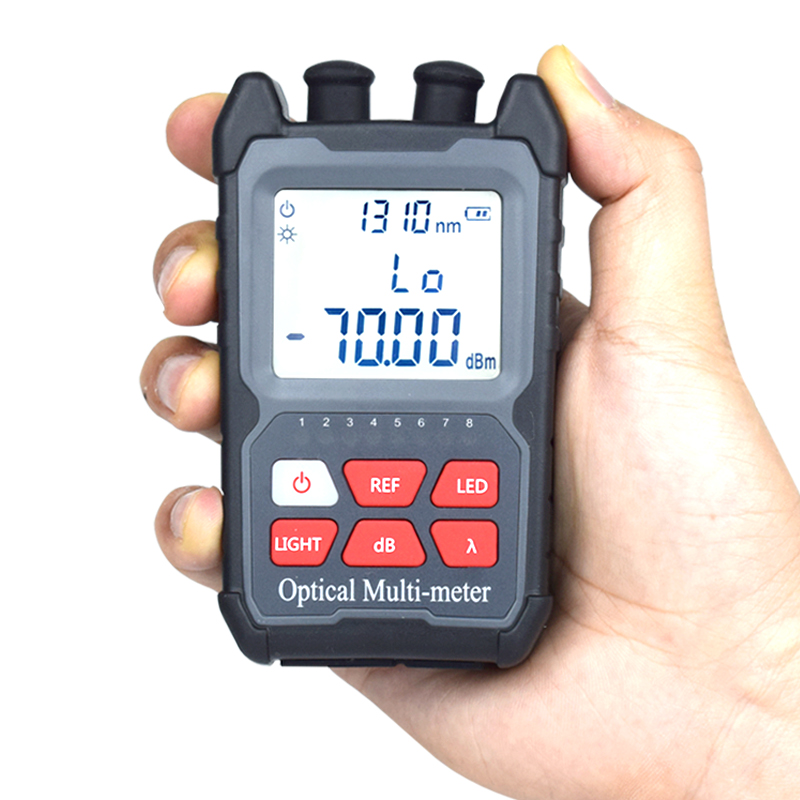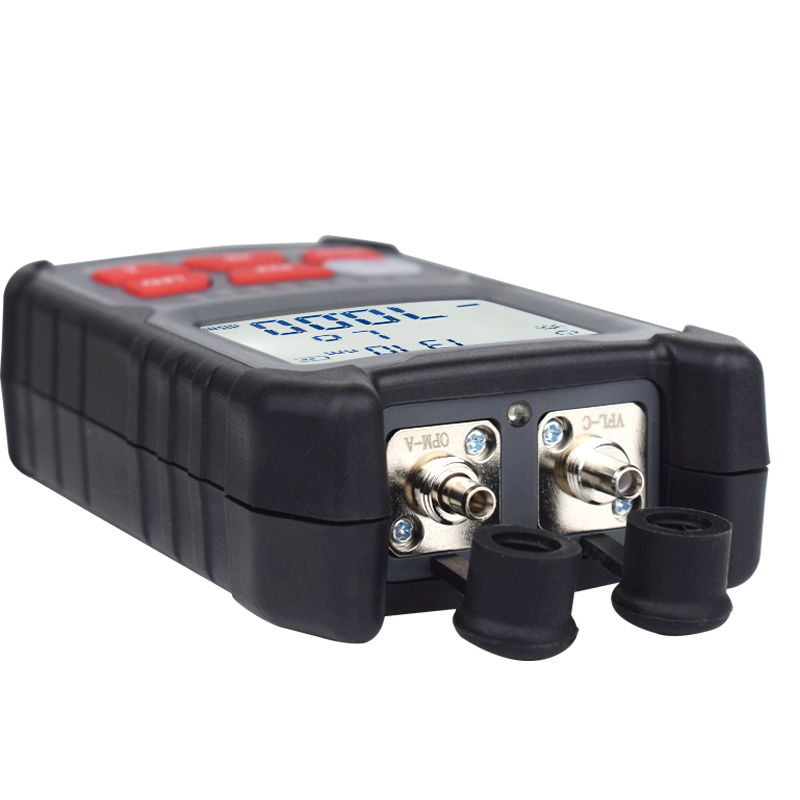 The handheld optical power meter & visual fault locator all-in-one series are mainly used for continuous optical signal power measurement, optical fiber link loss test and optical fiber line continuity test. It is controlled by a single-chip microprocessor and has complete functions. It is widely used in optical cable construction and maintenance, optical fiber communication, optical cable sensing, optical CATV and other fields. The body design meets the requirements of ergonomics and adopts advanced thermoplastic molding technology, which is beautiful and durable. The optical power meter & visual fault locator all-in-one uses embedded detectors and lasers to protect it well. The all-in-one has a small appearance, automatic shutdown function, three red light modes, backlight display, wavelength memory function, optical fiber working identification, support user calibration, wide test range, and support lighting.