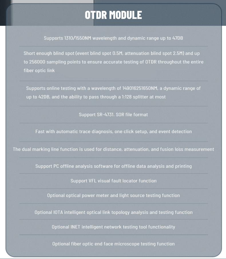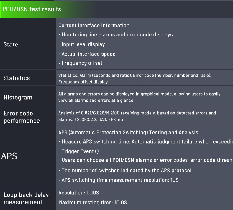 2. Support SDH/SONET test function for STM-1/OC-3 electrical port, STM-1/4/16 and OC-3/12/48 optical port
