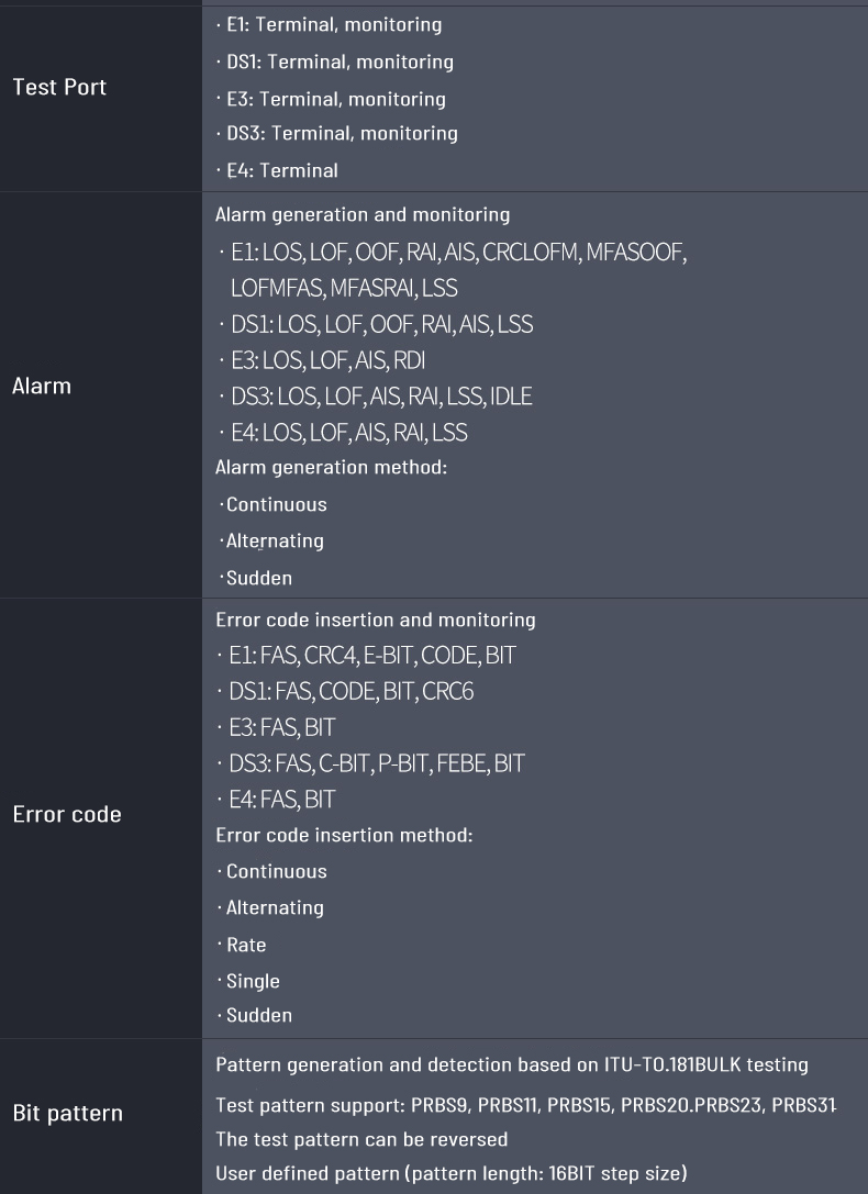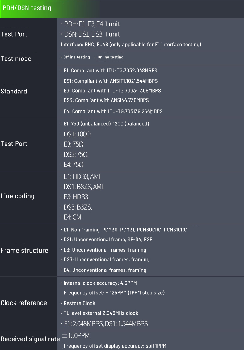 1. Support DSn/PDH test function for DS1/DS3, E1/E3/E4 interface