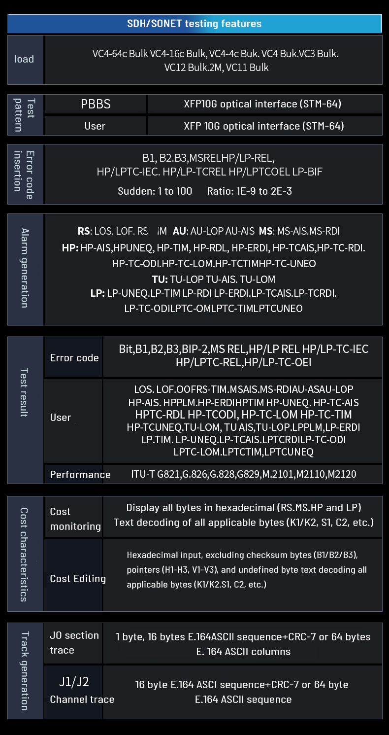 2. Support SDH/SONET test function for STM-1/OC-3 electrical port, STM-1/4/16/64 and OC-3/12/48 optical port