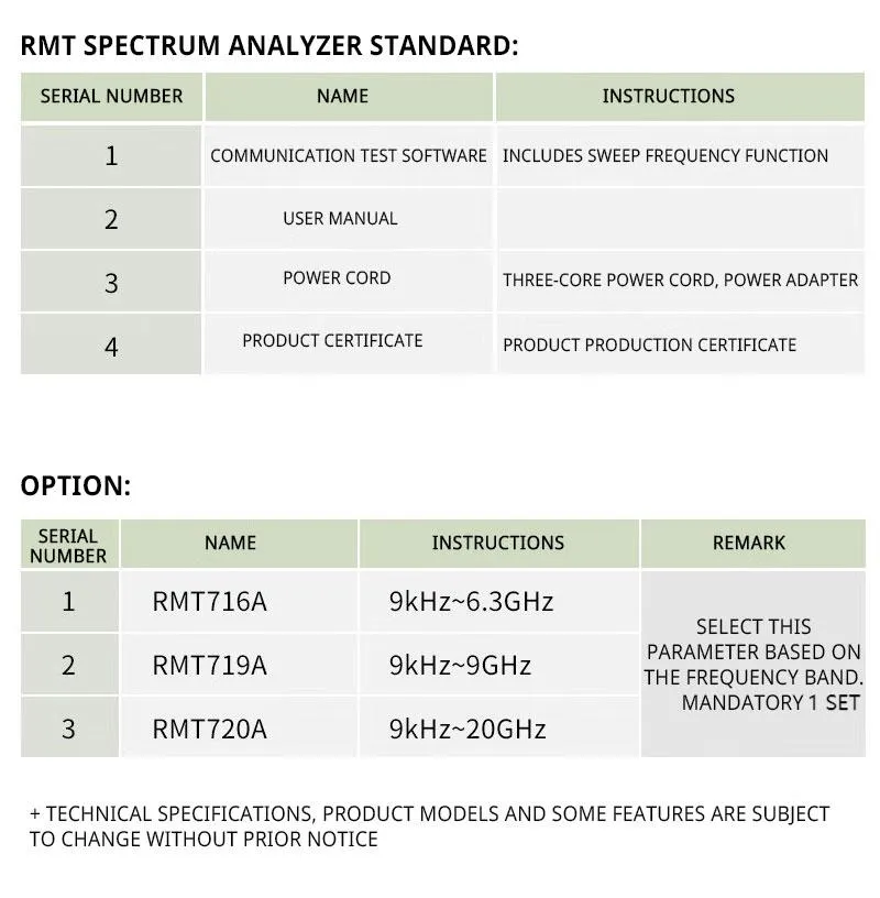Frequency Range: 5KHz-4.5GHz/6.32GHz/7.5GHz/9GHz/20GHz/40GHz
