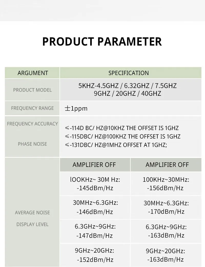 | Frequency Range | 5KHz~4.5GHz | 5KHz~6.32GHz | 5KHz~7.5GHz | 5KHz~9GHz | 5KHz~20GHz | 5KHz~40GHz |