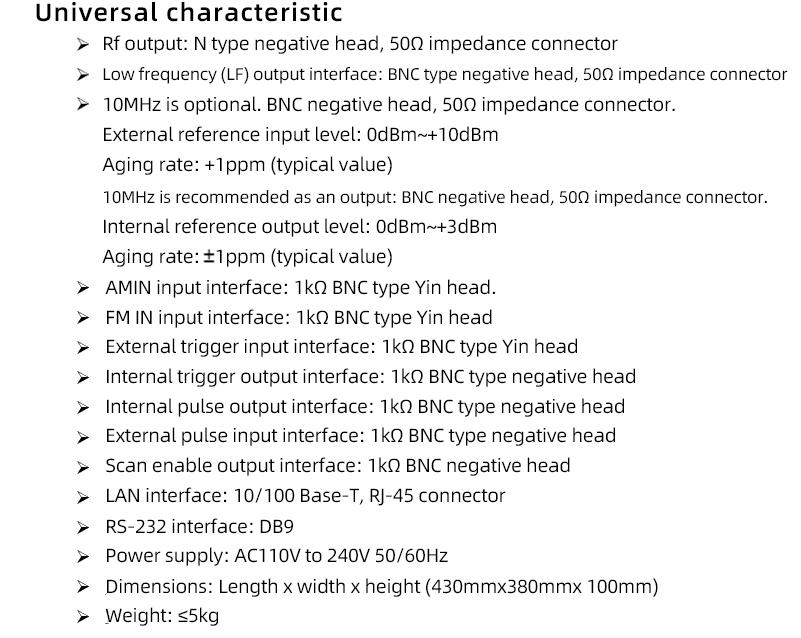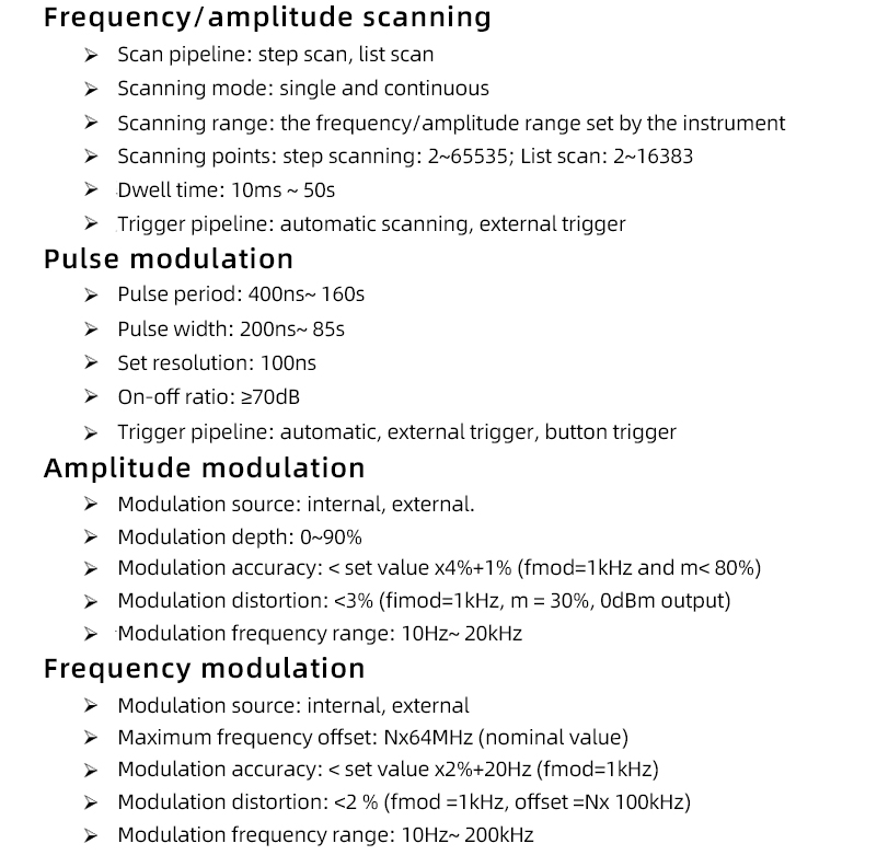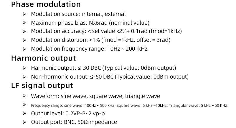 6. Provide internal modulation source: sine wave, square wave, triangle wave, sawtooth wave.