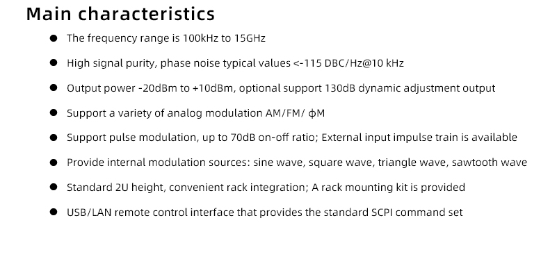 The TFN TG115 Microwave Signal Generator is designed to be a versatile and cost-effective signal generator covering the frequency range of 100kHz to 15GHz, with a variety of commonly used analog modulation functions (AM/FM/ϕM), pulse modulation, low frequency output and frequency/amplitude scanning functions. These functions make the generator a flexible and versatile instrument suitable for teaching, research, product development, production and maintenance, meeting the needs of different application scenarios. The rich logic hardware interface and wide-screen LCD display make it easy for you to perform various control operations. The standard 2U height chassis, complete standard SCPI command set and universal multi-communication mode bring you great convenience for remote control and secondary development.
