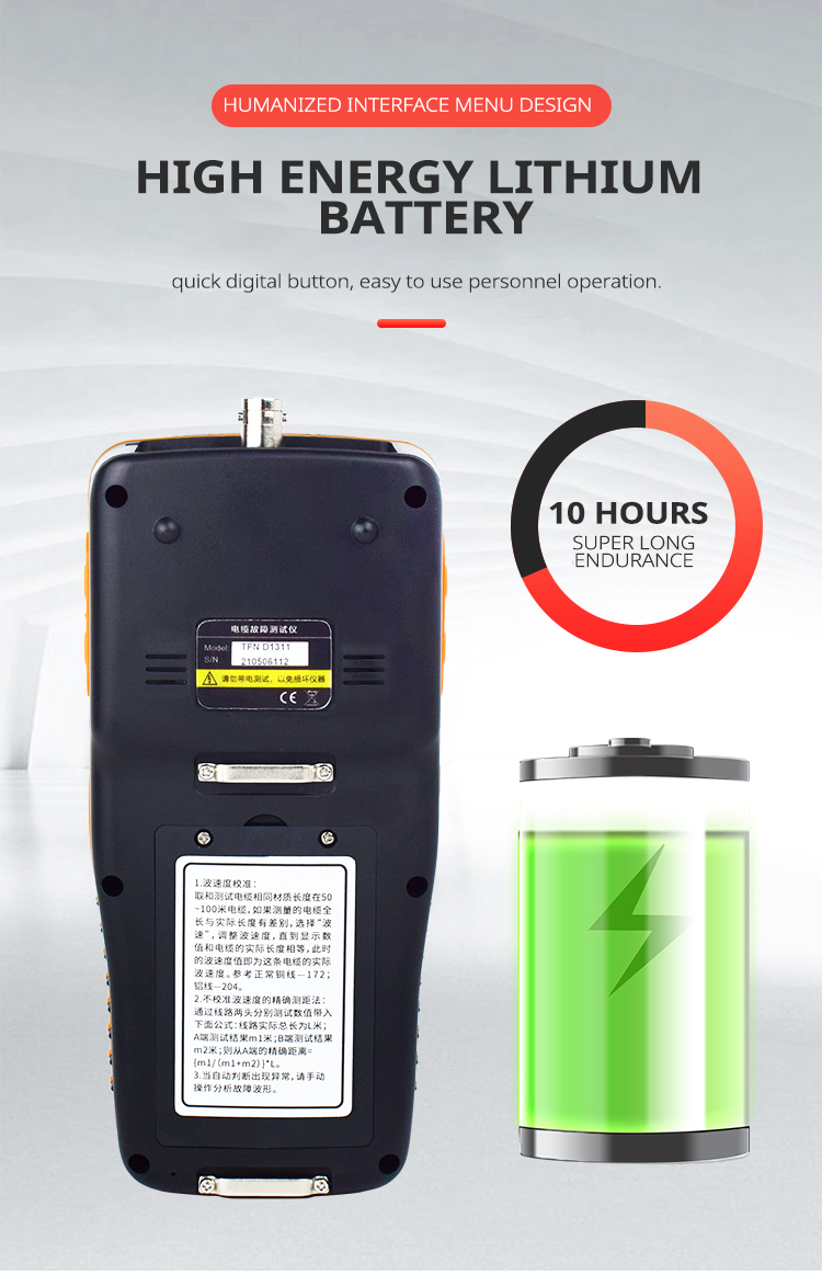 The TFN D131 Cable Fault Tester (hereinafter referred to as the tester) is suitable for automatic measurement of the precise location of core barriers such as broken wires, mixed wires, and ground gas in power cables and communication cables.