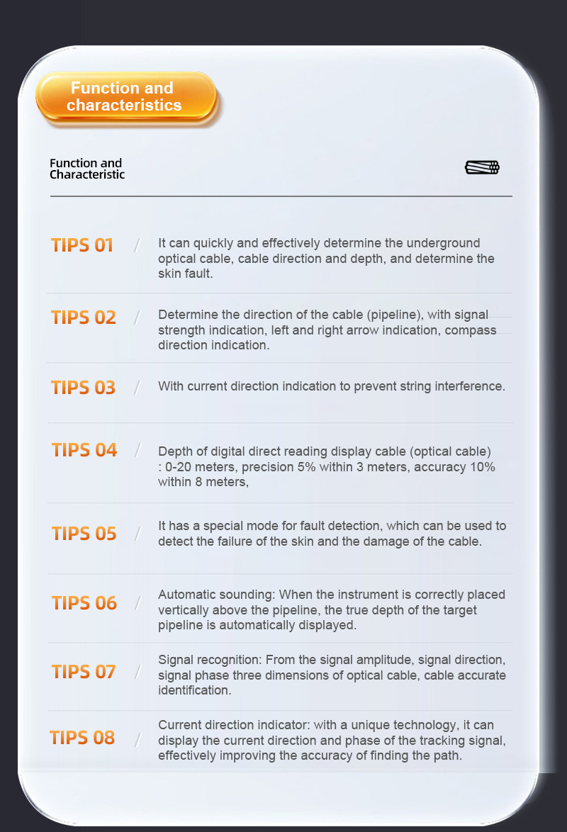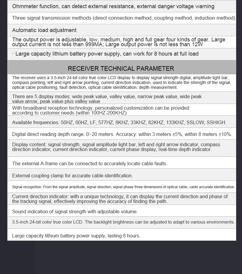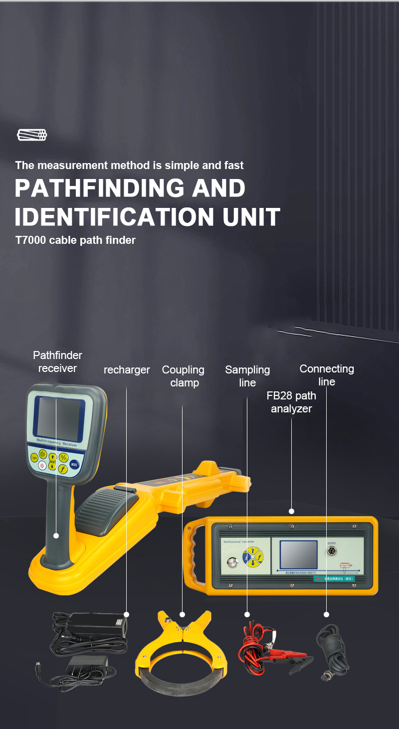 Path unit is divided into transmitter and receiver, is based on the principle of reflection of electromagnetic waves in the transmission process and the principle of electromagnetic induction, combined with digital filtering, wireless reception, software control and design of high-tech products. The signal of the transmitter is directly applied to the target cable (blackout cable) by a direct line, i.e. the direct connection method. Detecting the path is one of the main roles of this instrument, different sites can choose a different way of applying the signal, the choice of priority is: direct connection. The reception and detection of the signal is not affected by the method of signal application, and the operation is the same.