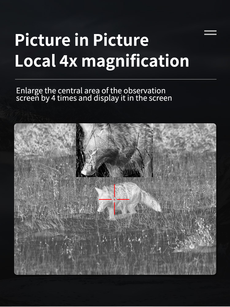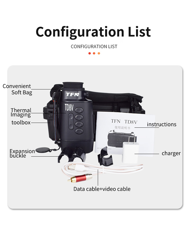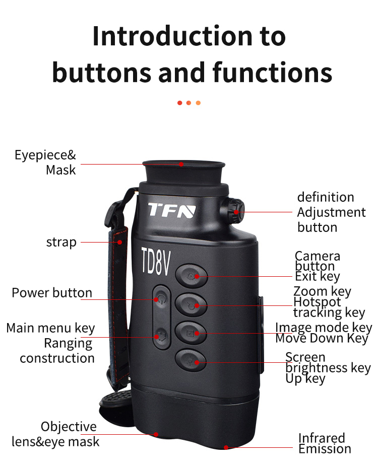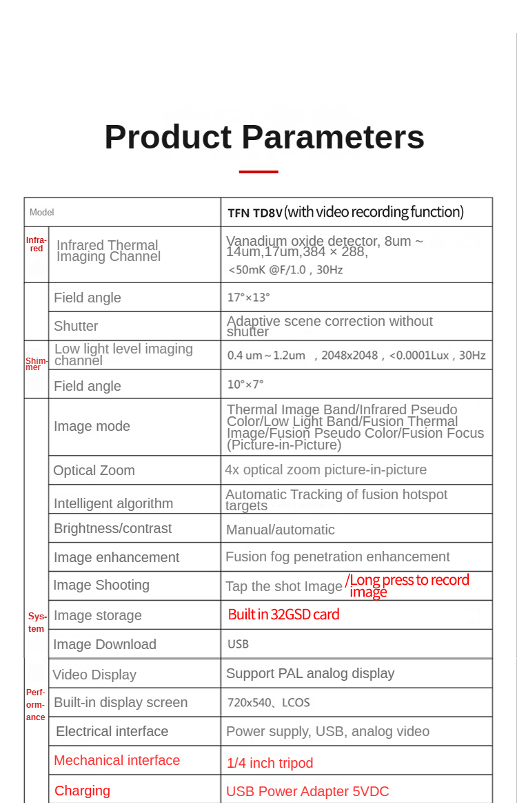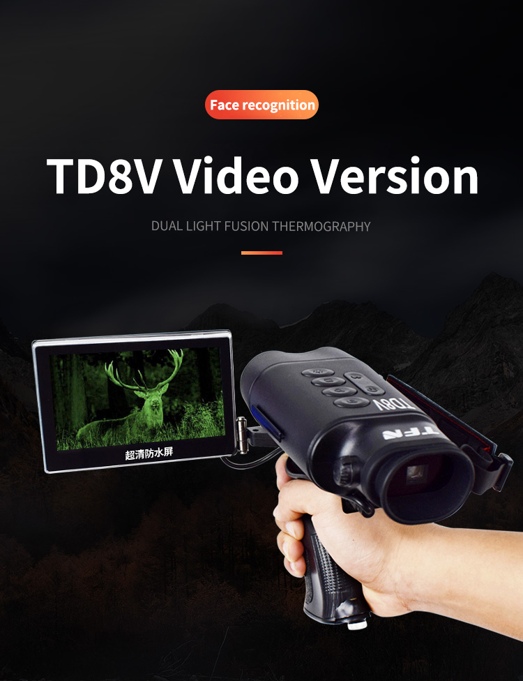 TFN TD8V (with video function) This is a dual-optical fusion thermal imaging night vision camera with video function. It adopts infrared, micro-light fusion, combining the respective advantages of infrared, micro-light, so that the imaging resolution is higher, the single body is easier to be recognized, and solved the single infrared can not pass through the defects of the glass, at the same time, it is a new addition to the fusion of the focus (picture-in-picture) function, which can be zoomed in on a single point and maintain a high degree of clarity.